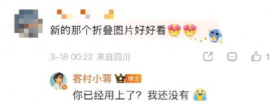 而对于此次折叠发图功能,客(ke)村小蒋在微(wei)博上与网友互动时(shi)称:“你(ni)已经用上了(le)?我还没有。”