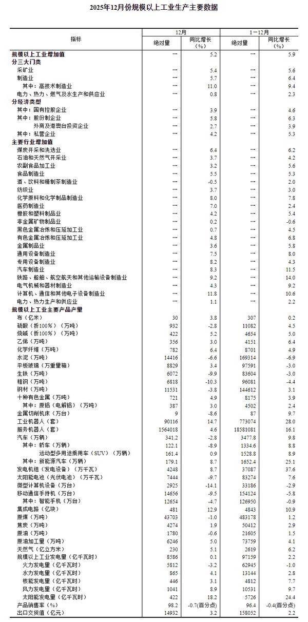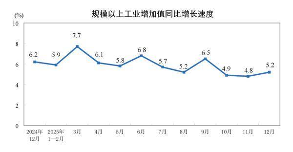 中国网财经1月19日讯 据国度(du)统计局音讯,2025年(nian)12月份,规模以上(shang)产业添加值(zhi)同比(bi)现实增长5.2%(添加值(zhi)增速(su)均为扣(kou)除代价要素的现实增长率(lu))。从环比(bi)看,12月份,规模以上(shang)产业添加值(zhi)比(bi)上(shang)月增长0.49%。2025年(nian),规模以上(shang)产业添加值(zhi)比(bi)上(shang)年(nian)增长5.9%。