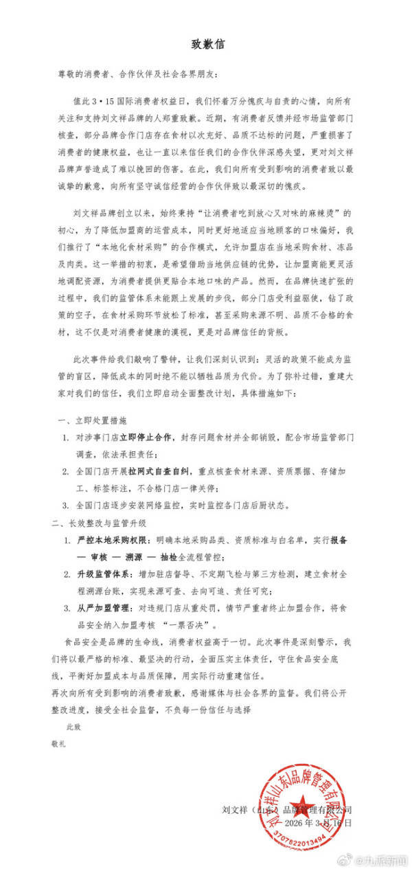 针对被指“鸭肉(rou)当(dang)猪肉(rou)牛肉(rou)卖”等(deng)问题,16日,麻辣烫品牌刘文祥发布致歉信,“我们怀(huai)着万分愧疚与自(zi)责的心境,向全部存眷和支持刘文祥品牌的人郑重致歉”。刘文祥品牌提出的具体步伐包括“对涉事门店立即(ji)停(ting)止合作,封存问题食材(cai)并全部销毁,配合市(shi)场(chang)羁系部门观察,依(yi)法(fa)承担(dan)责任”等(deng)。