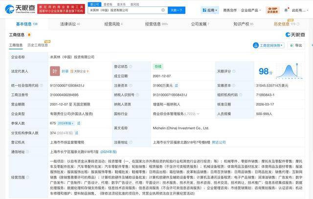 天眼查工(gong)商信息表现,近日,米其林(lin)(我国)投资有(you)限公司产生工(gong)商变更,注册资本由2.24亿美圆增至3.19亿美圆,增幅约42%。